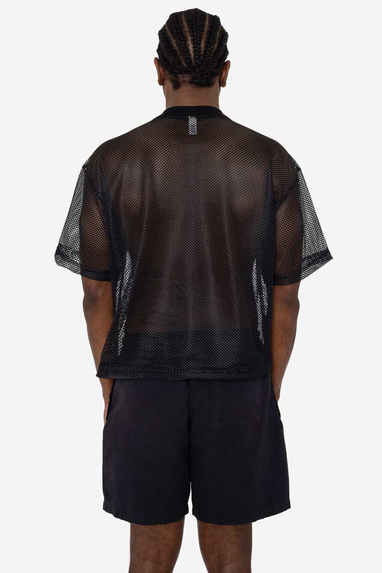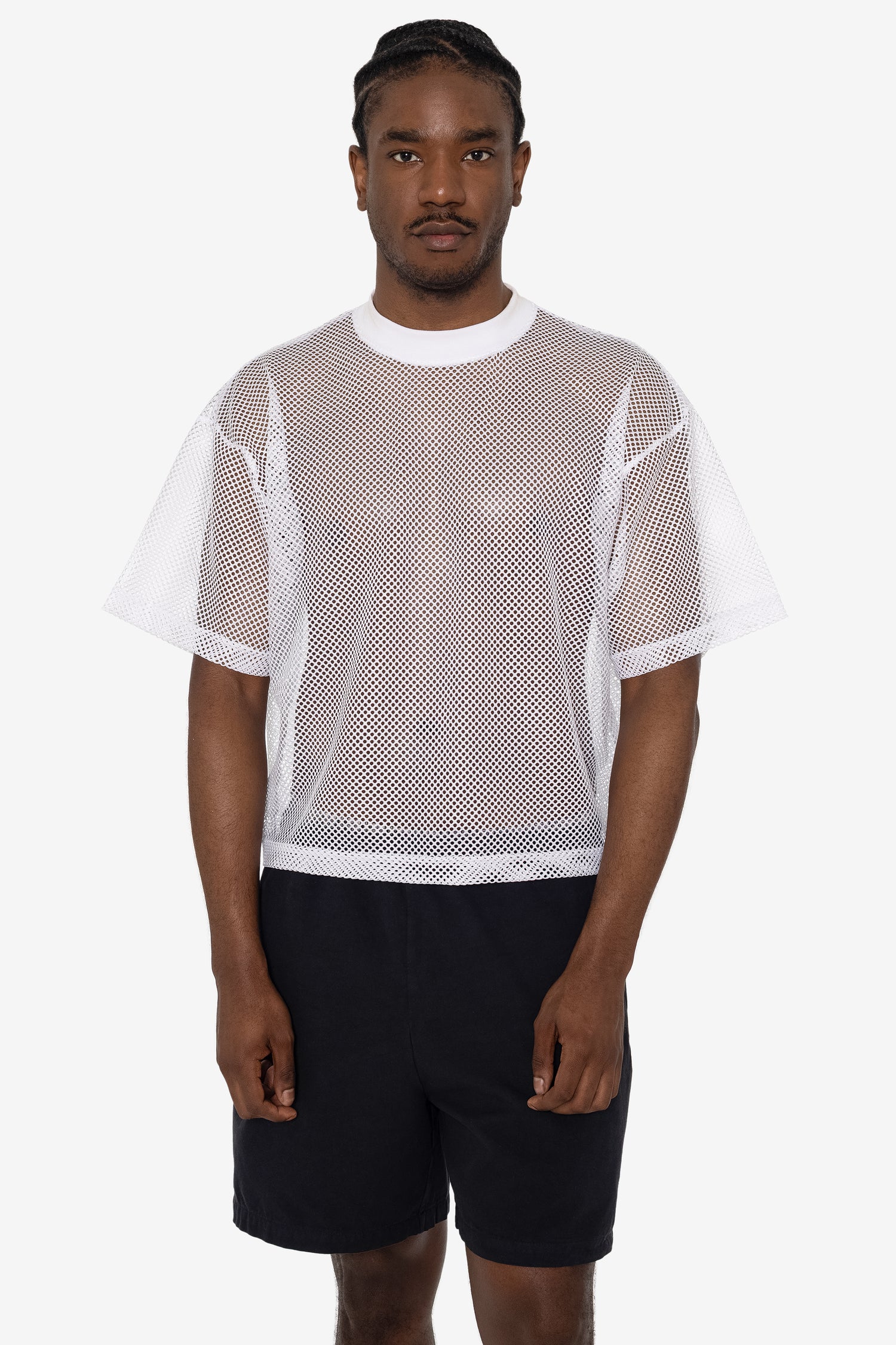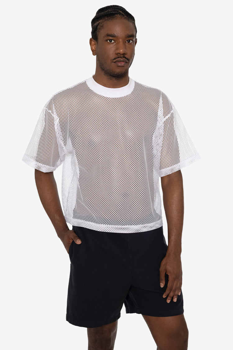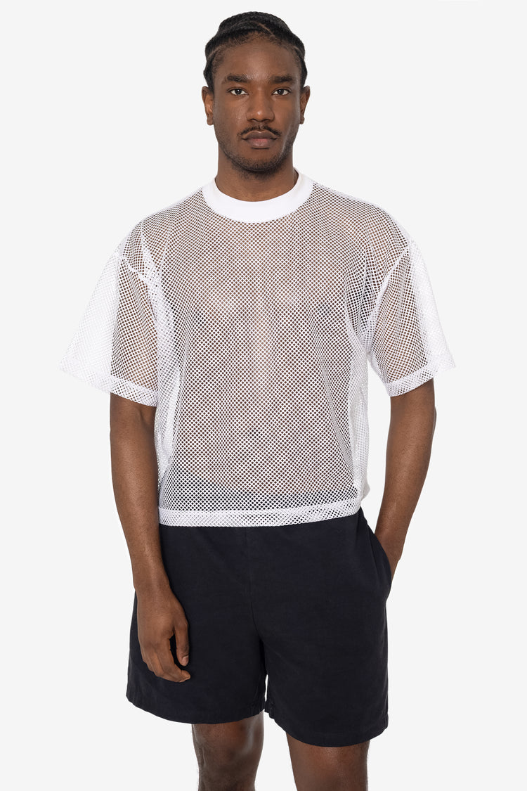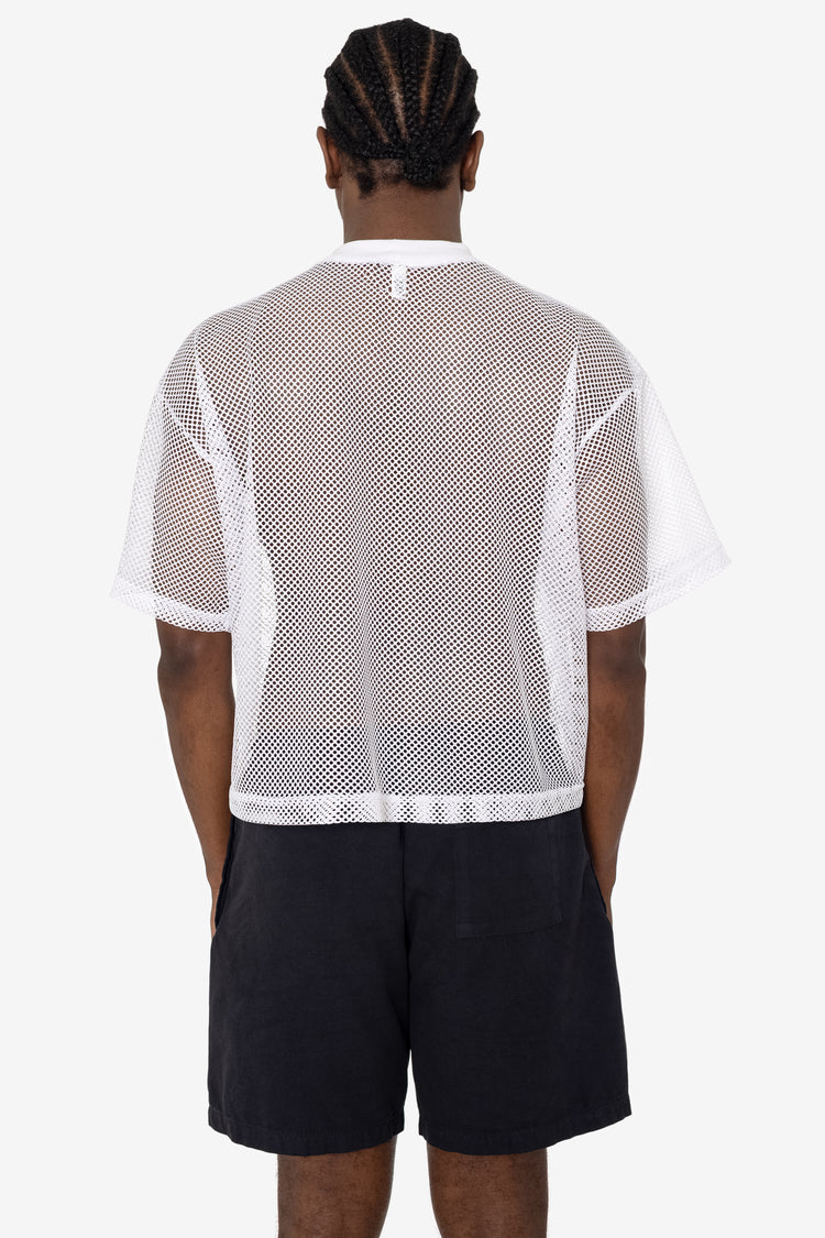The King Mesh T-Shirt is designed with a relaxed silhouette offering a touch of athletic style. Ideal for hot days, this unisex tee features a wide, cropped fit for easy, breathable wear. Its lightweight fabric makes it a versatile addition to your wardrobe, whether worn alone or layered.