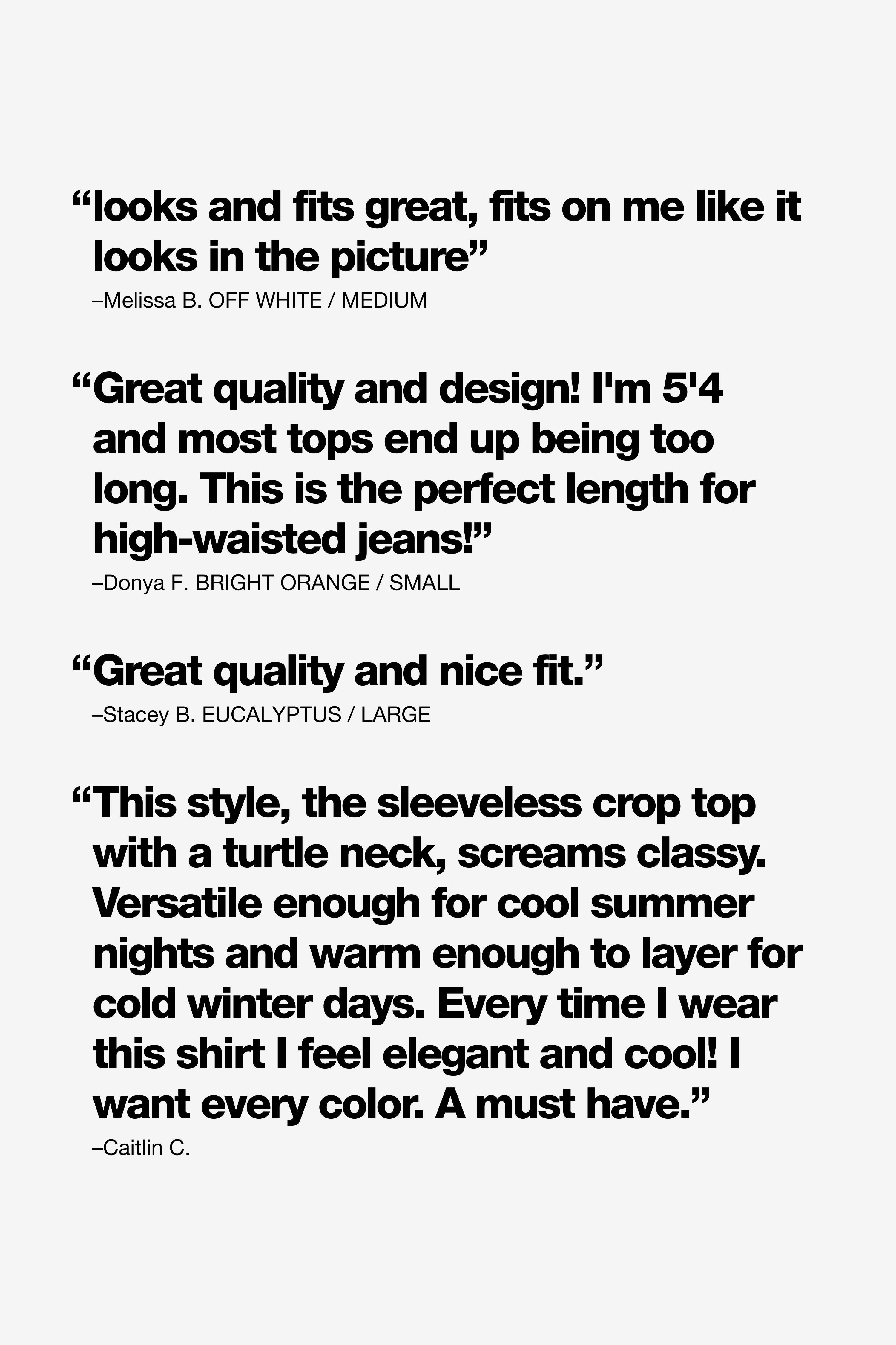 This style, the sleeveless crop top with a turtle neck, screams classy. Versatile enough for cool summer nights and warm enough to layer for cold winter days. Everytime I wear this shirt I feel elegant and cool! I want every color. A must have.