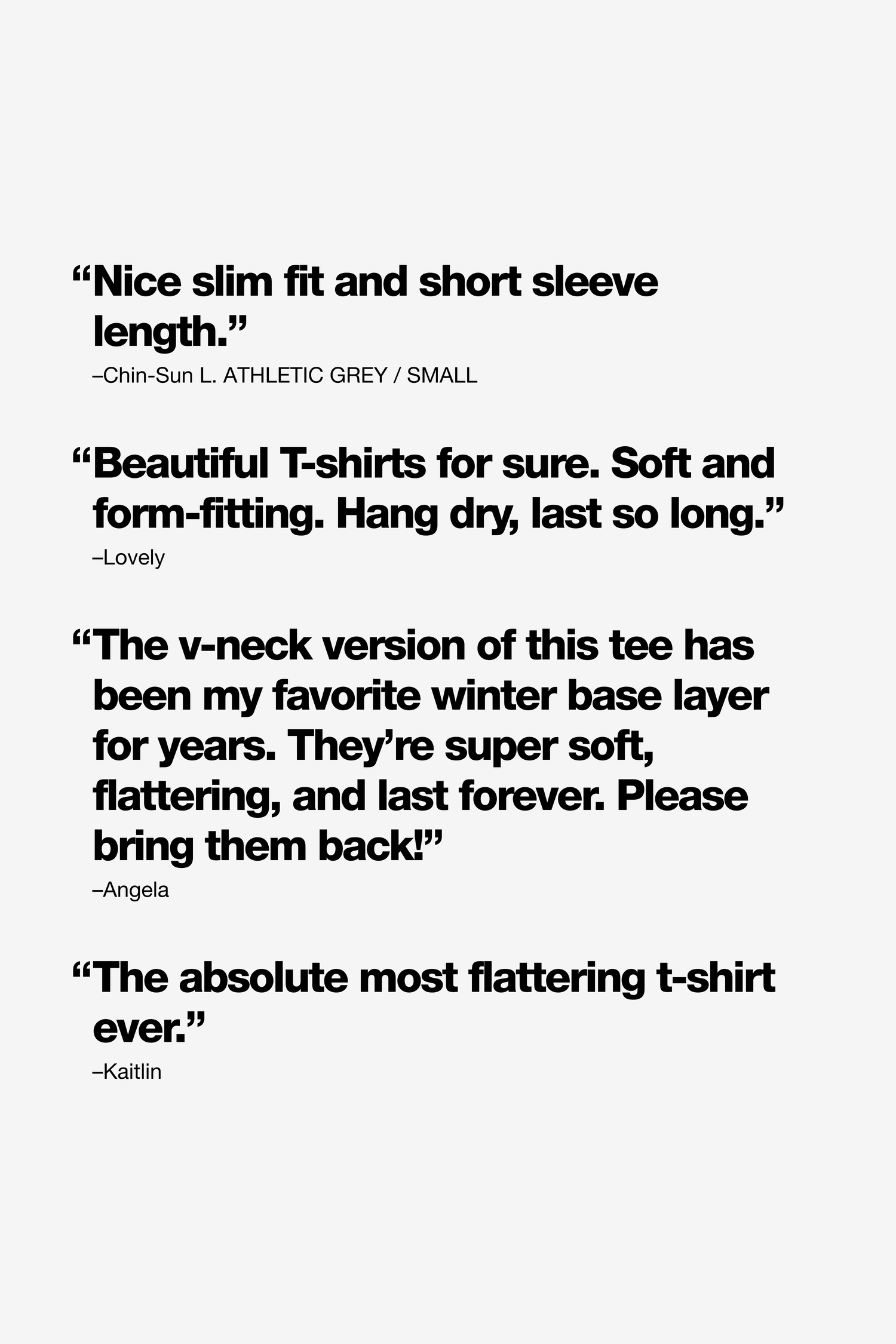 Beautiful T-shirts for sure. Soft and form-fitting. Hang dry, last so long. LAA: Please never be out of stock; please keep making these - so wonderful. xoxoxo