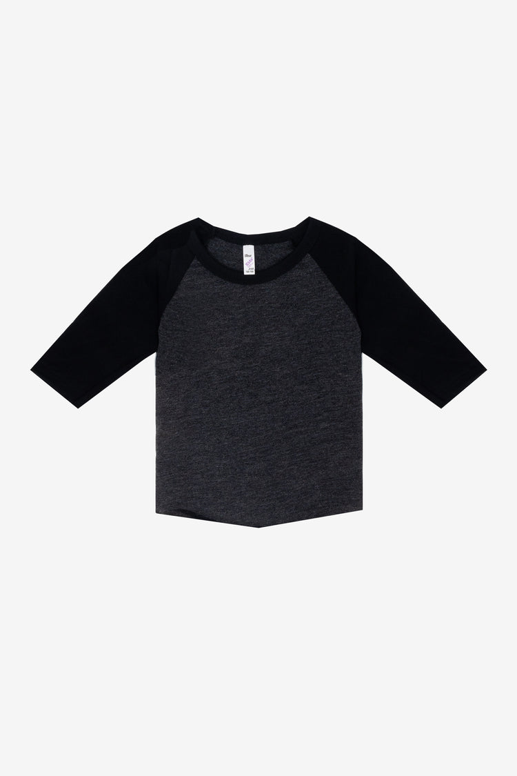 This classic unisex children's raglan is made from one of our bestselling, original textiles. Our 50/50 poly cotton is lightweight and versatile. This style features 3/4 length sleeves and a raw-finished hem.