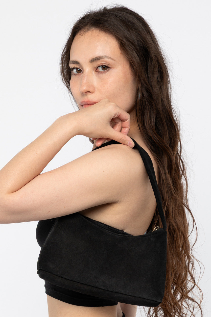 We chose suede leather for this snug shoulder bag for its naturally velvety finish. The interior is lined with a heavyweight water and stain resistant nylon. The opening utilizes a durable metal zipper with a matching suede pull.