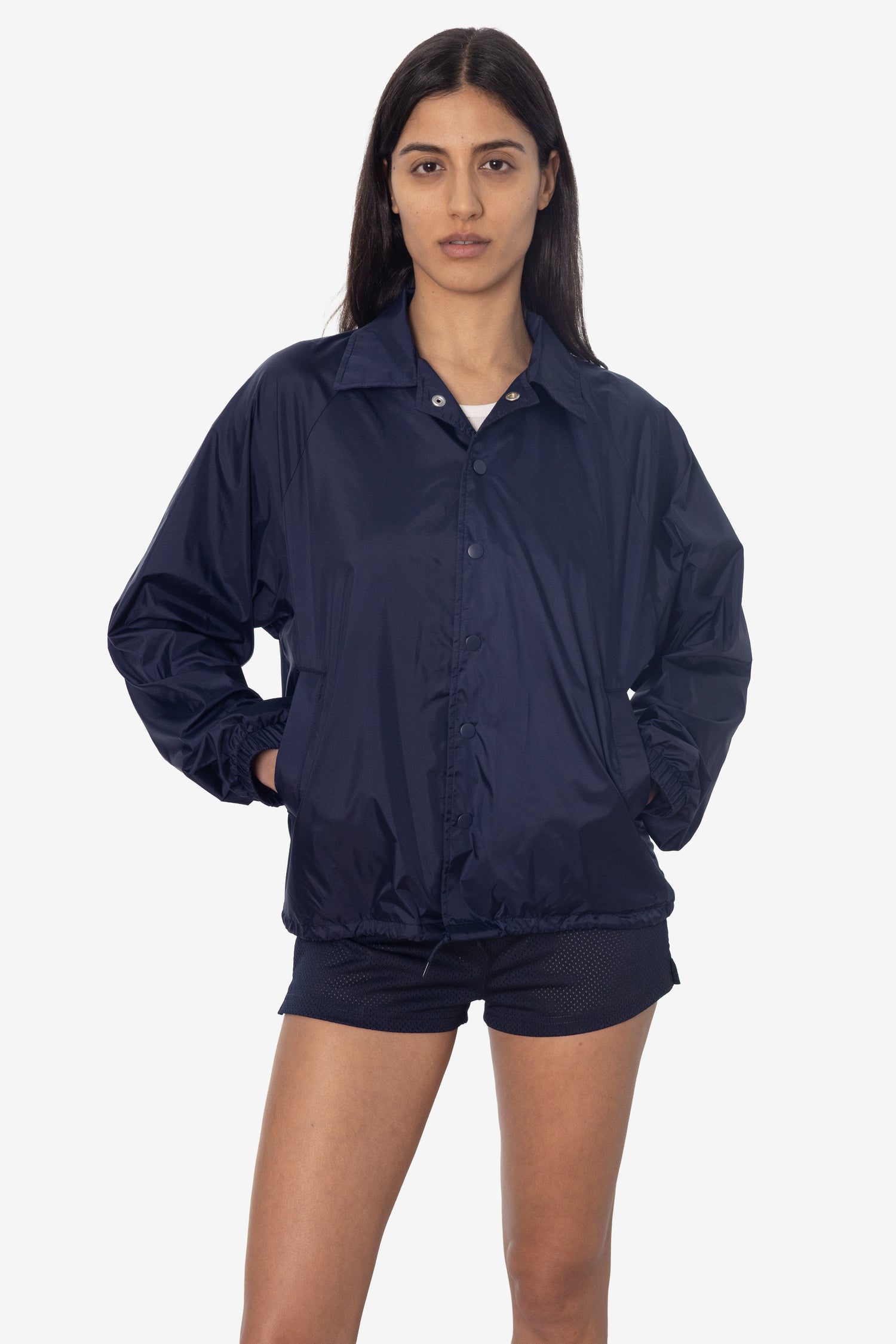 Our classic Coaches Jacket is a practical addition to your outerwear collection. Made of a lightweight, water resistant nylon for protection in the wind and rain and lined with 36/1 jersey - 50% cotton 50% polyester for comfort and warmth. We gave this raglan-sleeve jacket an oversized fit with generous armholes that allow ease in movement and 2 deep side pockets. This jacket features a snap button closure and sleek collar with elastic cuffs and adjustable bottom hem.