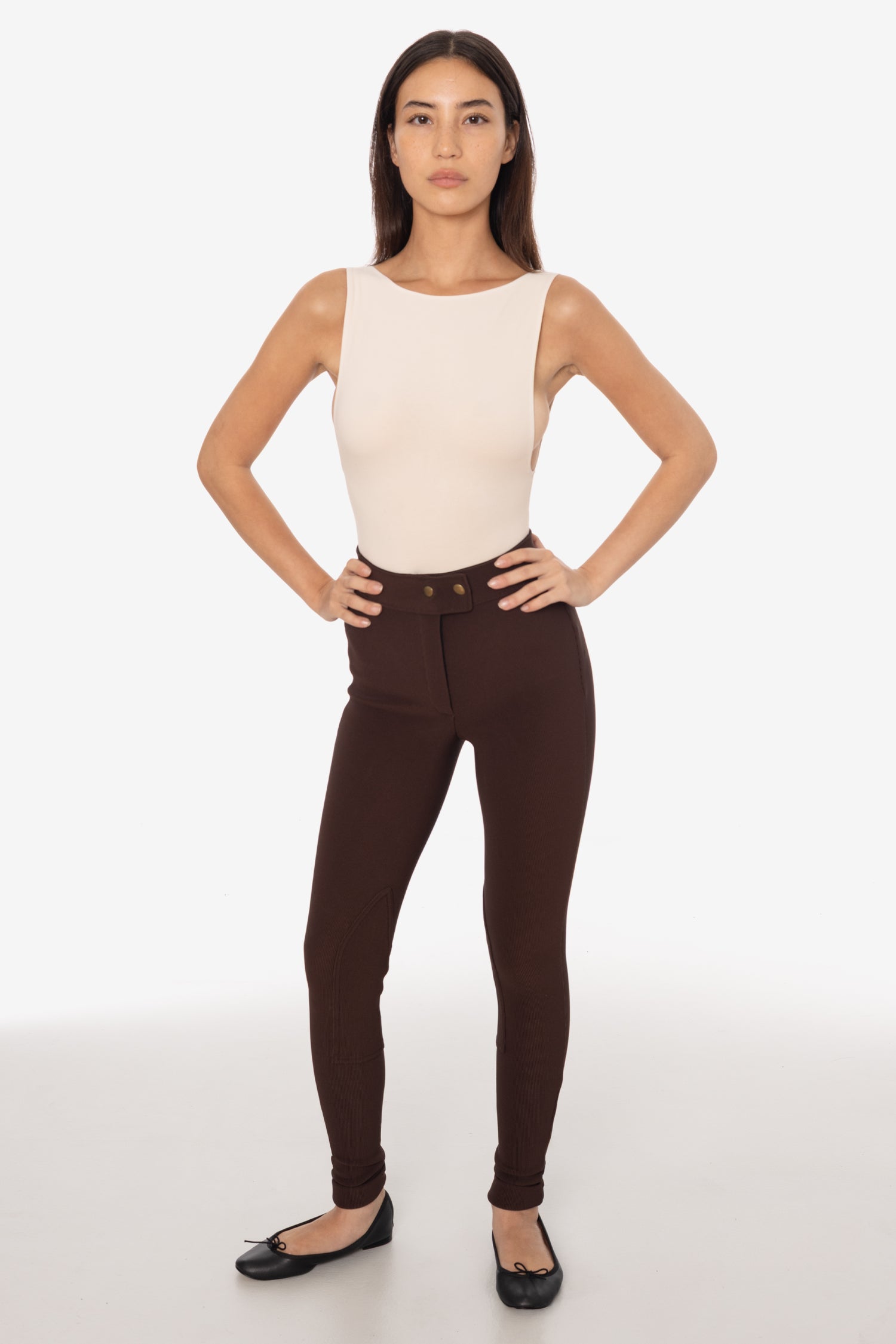 The Original Riding Pant. Still made in Los Angeles. Still Sweatshop free. These pants feature a classic high rise waist and are fitted throughout with patches on the inner knee. Constructed out of a stretchy, durable, ribbed nylon ottoman fabric of traditional sportswear quality. This compressive pant is finished with a 2 inch woven elastic waistband, zipper fly and 2 brass snap buttons. Channel your inner horse girl with a sweater and boots or a crop top in the summer.